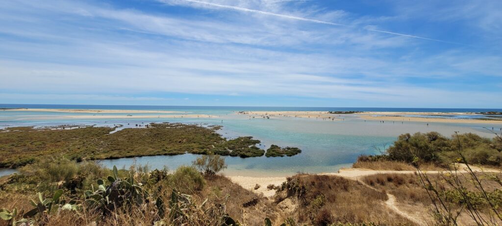 I punti da cui accedere al parco di Ria Formosa sono molteplici lungo tutta la costa, ma questo ha un fascino davvero unico. La vista dall’alto dei pallidi isolotti che emergono a filo d’acqua, già vale il viaggio. La discesa fino alla riva, resa un po’ incerta dall’assenza di segnaletica e dall’abbondanza di vegetazione, svela poco a poco la conformazione della laguna, fin quando non si sale sul taxi-barchetta e la vista può liberarsi finalmente sull’intero piano dell’orizzonte.