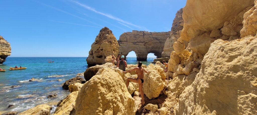 Con l’oceano sempre alla nostra sinistra, abbiamo guidato fino a Praia da Marinha (lasciando la macchina in un parcheggio a circa venti minuti di cammino dalla spiaggia vera e propria) e, con un po’ di arrampicata tra gli scogli, siamo arrivati fino all’attigua Praia da Mesquita.