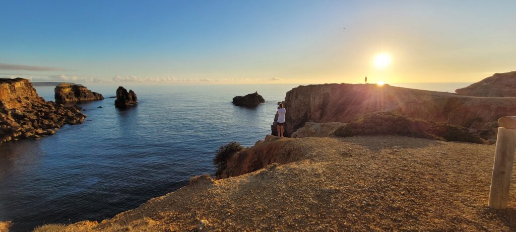 La fine del nostro indimenticabile viaggio verso l’ovest coincide con i cancelli rossi del faro di Cabo de São Vicente (più una breve “licenza poetica” in direzione nord, sulla selvaggia costa vicentina). L’estremità sud-occidentale d’Europa è un promontorio che deve il suo nome a un sacerdote spagnolo martirizzato dai romani. Questo luogo unico attrae migliaia di visitatori all’anno: ci si trova, dopotutto, a strapiombo sull’oceano da una prospettiva privilegiata. Il pranzo è servito, per così dire, da una manciata di furgoncini di street food parcheggiati appena fuori l’area del faro (sarà che ero affamata, ma ho trovato squisito anche il panino comprato lì, ripieno di carne sfumata nel vino).