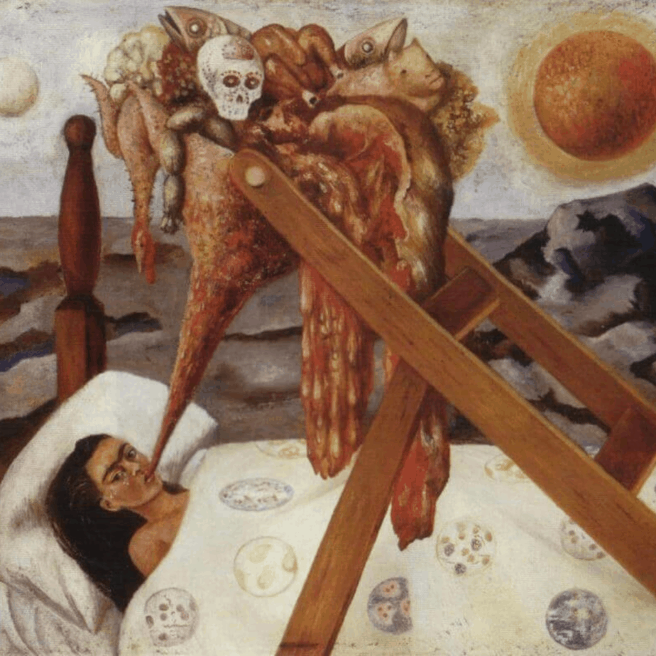 “Senza speranza” è l’emblema di quel periodo così angusto della sua vita, in cui Frida perde l’appetito ed è costretta a nutrirsi attraverso un imbuto che nella tela raffigura come un macigno sorretto da una scala di legno. Il cibo costituisce per lei un’ossessione, la stessa che nel XX secolo colpisce la società: sia per l’eccesso, sia per la mancanza, esso diventa il fulcro delle nostre esistenze tanto da diventare tanto un Dio, quanto un incubo.